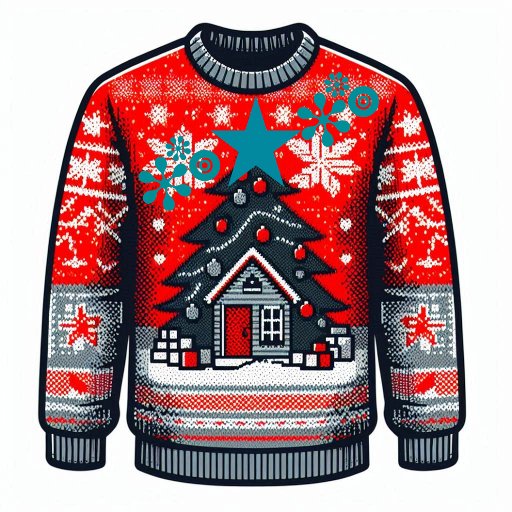 Leg de essentie van vakantie-nostalgie vast met een lelijk kersttrui-ontwerp met een rode trui versierd met een versierde boom, sneeuwmanmotief en cadeaus. Geflankeerd door twee kerstboommotieven, zit het tegen een grillige achtergrond van rode en groene stippen. Voel je vrij om de kerstgroet te personaliseren naar jouw voorkeur.