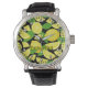 Citroenschijfjes en bladeren. Naadloos patroon. Aangepaste achtergrondkleur. Eigen Tekst.