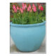 Roze tulpen in een grote blauwe pot, klaar voor de lente
