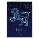 Kaart met het zodiumsymbool voor Leo in zacht zilverblauw, bedekt met de sterren van de constellatie, tegen een sterrenhemelachtergrond die van diep-middernacht blauw tot zwart is gesorteerd.