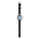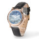 Vloeiende witte wolken in een blauwe lucht. Het basisklokgezicht in zwart, shows dashes voor notulen, groter voor vijf minieme intervallen.