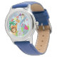 Een fantastisch horloge voor elke kleine jongen of meisje, met een vrolijke leuke grillige cartoon oerwoud dieren thema ontwerp. Een schattige Leeuw, olifant, nijlpaard, giraffe en een brutale kleine aap een leuke en speelse scène waar elk kind van zal houden.
