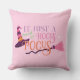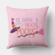 Leuk Leuk Roze Heks Hocus Pocus Halloween Pet Sierkussen, Veel plezier met vrienden en familie met dit schattige spooky gepersonaliseerde Halloween kussen. Het stijlvolle typografische ontwerp is voorzien van "It's just a bunch of Hocus Pocus" met gele, paarse en pastelroze, sinaasappel, start- en heksenbezemsteel, heksenpet, op een roze achtergrond.