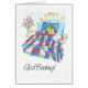 Een Get Well kaart met de groet in het Deens, met een groene kikker, liggend in bed met een warmwaterfles en medicijnen, druiven en bloemen rondom hem, van een handgeschilderde grillige illustratie van Judy Adamson. U kunt desgewenst uw eigen inside-bericht toevoegen.