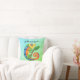 Dit werpkussen heeft een leuke hagedis in felle kleuren blauw, groen, sinaasappel en geel met een stok met een groen blad met grote witte ogen op een achtergrond gemengd blauw en groen. Pas jouw tekst aan met de sjabloon aan de voor- en achterkant.