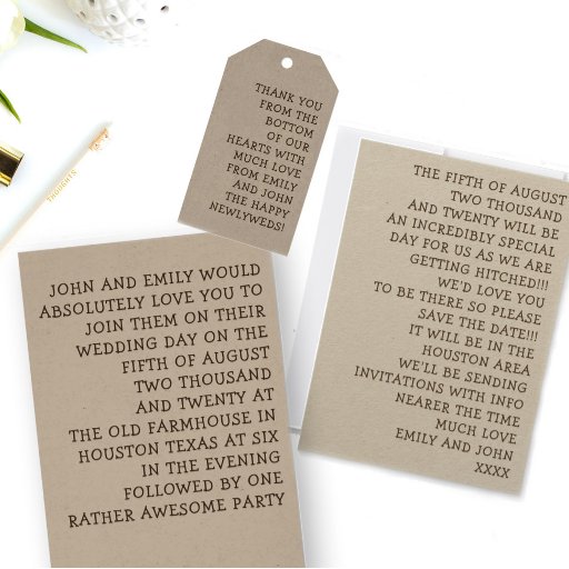 Je hebt gewoon een fantastische trouwdag gehad en ongetwijfeld hebben je familie en vrienden geholpen om het heel leuk te maken! Stuur ze een bedankbriefje naar show hoeveel hun bedrijf op uw dag voor u betekende met dit eenvoudige, maar stijlvolle, typografische ontwerp en uw woorden maken het natuurlijk extra speciaal! De tekst is eenvoudig te personaliseren, hoewel ik voorstel om de tekst ongeveer even lang te houden, of u kunt de optie Schalen omhoog en omlaag in het gereedschap Aanpassen gebruiken om de tekstgrootte indien nodig aan te passen. U kunt ook het lettertype en de kleur wijzigen als u dat wenst via de optie Klik om Verdere aanpassingen aan te passen. Wissel je favoriete foto van portretoriëntatie op de achterkant en je gasten zullen ook een super aandenken! Ik heb gekozen voor de Kraft papier optie in overeenstemming met een rustiek gevoel.