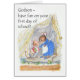 Een 'Have Fun on your first day at School'-wenskaart voor een Godson, met een klein muisje dat het huis verlaat om op weg te gaan naar zijn eerste schooldag. Dit ontwerp is van een met de hand geschilderde aquarel illustratie van Judy Adamson. Je kunt de inside message personaliseren.