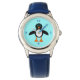 Dit geweldige horloge heeft een schattig pinguïnpersonage met een witte buik, grote blauwe ogen met zwarte pupillen en schattige oranje voetjes en snavel. Deze charmante kleine wintervogel is zeker om kinderen en volwassenen te verrukken. De pinguïn zit op een ijzige bleek blauwe achtergrond om hem te herinneren aan zijn kille Arctische huis.