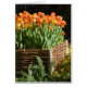 Vibrant oranje en gele tulpen in een tuinbed met een hoge tuinstructuur, omringd door gieren