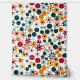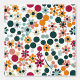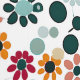 Dit kunstwerk is een levendig en kleurrijk patroon met een reeks gestileerde bloemen en cirkelvormige vormen verspreid over een witte achtergrond. Het ontwerp wordt gekenmerkt door een mix van warme tinten zoals sinaasappel, rood en geel, in tegenstelling tot koelere tinten blauwgroen en groen. De compositie heeft een speels en dynamisch gevoel, waarbij de overlappende cirkels en bloemblaadjes een gevoel van beweging en ritme creëren.