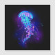 Groot, blauw, kunstmatig getrokken, gloeiende, heldere kwallen, met lange tentakels op zwarte achtergrond met paarse bioluminescentie. Lumineuze kwallen.