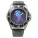 Groot, blauw, kunstmatig getrokken, gloeiende, heldere kwallen, met lange tentakels op zwarte achtergrond met paarse bioluminescentie. Lumineuze kwallen.