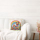 Dit kussen cadeaus een vrolijke kameel samengesteld uit een levendig patchwork ontwerp, tevreden zittend onder een boogvormige regenboog. Elk deel van zijn lichaam is ingewikkeld gemodelleerd met een verscheidenheid aan kleurrijke, quiltachtige texturen, waardoor een visueel feest van textielkunst wordt gecreëerd. De zachte uitdrukking van de kameel voegt een vleugje warmte en vriendelijkheid toe aan de scène. Het is omgeven door een overvloedige tuin van fantastische bloemen, elke bloei draagt bij aan een gevoel van grilligheid en weelderigheid. De regenboog overhead voegt een klassiek symbool van hoop en vreugde toe, waardoor de algemene sfeer van het afbeelding wordt verbeterd. Deze speelse en fantasierijke illustratie is perfect voor een reeks gezinsvriendelijke producten die een glimlach en een vleugje kleur in het dagelijks leven willen brengen.