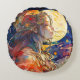 Een levendige ronde kussen met een waterverf schilderij van een meisje en een maan.