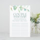 Dit botanische Eucalyptus LGBTQ Koppel Naam Spel bruiloftsshower spelblad zal veel plezier en gelach toevoegen aan uw feest! De pagina is zowel elegant als modern. Het mooie ontwerp met een stuk eucalyptus in eigentijdse waterverf stijl is perfect voor elke bruiloft. Om dit spel uw eigen te maken, selecteert u 'Personaliseer deze sjabloon' en typt u de namen van het gelukkige paar.