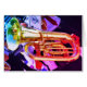 Deze kleurrijke glanzende buik maakt deel uit van een Portuge brass band uit Montreal in Canada, die een bezoek brengt aan de Portugese gemeenschap in Hull (Gatineau) Quebec. Dit afbeelding is geweldig om naar vrienden en familie, muziekliefhebbers, muzieleraar of student, tuba-spelers, iedereen die van marchingbanden geniet, brassbanden, messing instrumenten en tubas in het bijzonder te sturen. De metalen messing is een combinatie van koper en zink. Het heeft een mooie gouden gloed en wordt vaak gepolijst naar een warme patina. Je kunt reflecties van mensen, bomen en huizen zien in de rode bel van de tuba. Een beetje Tuba Trivia voor Tubaholics - uitgevonden in het begin van de negentiende eeuw, is de tuba het grootste en kleinste muziekinstrument in de brassfamilie. Het is ook geclassificeerd als een windenergie of aerofone. Een persoon die een tuba speelt, staat bekend als een tubaït of tubist in Amerika; in het Verenigd Koninkrijk is iemand die tuba speelt in een orkest een tuba speler; in een messenband, een basspeler. De basistuba werd in 1835 uitgevonden door een paar Pruisen (Noord-Duitsland); de tenor tuba van een van de oorspronkelijke uitvinders in 1838.<br> <br>Een groot deel van de bevolking van Hull is Portuge katholiek. Deze bruine band maakte deel uit van een processie met een standbeeld van Maagd Mary. Ze liepen een aantal straten rond en dan terug naar de kerk. De kerk staat aan de overkant van het park van mijn plaats, zodat ik elke zondag de levendige riemen hoor, en ook een paar andere dagen. Originele muzikale fotografie door M Sylvia Chaume, Quebec, Canada.