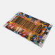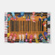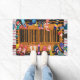 Een geschilderde deurmat met een barcodepatroon, met verschillende voeten en schoenen die erop staan. Welkom uw dierbaren in stijl met deze - Amusante barcode Design - Scan uw voeten voordat u de deurmat binnengaat.