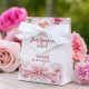 Een witte achtergrond versierd met een grote roze strik en rozen. Tekst: Liefde is in bloei. Personaliseer en de naam van de aanstaande bruid.