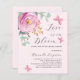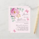 Een zachte blush roze achtergrond. Versierd met een roze roos en groen waterkleurig eucalyptusgroen en vlinders. Personaliseer en voeg jouw namen en feestdetails toe. Tekst: Liefde is in bloei. 1 vel = 1 uitnodiging afgedrukt rand tot rand.