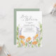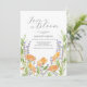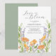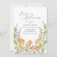 Vier je speciale dag met deze waterverf bloemige uitnodigingen, met delicate wilde bloemen in tinten oranje en lavendel, prachtig geaccentueerd met botanische saliegroene bladeren. Het elegante kalligrafische schrift leest "Liefde is in bloei", waardoor deze boho-chique trouwuitnodigingen perfect zijn voor een bloemige brunch, bruidsdiner of botanische bruids douche.