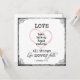 Liefde slaagt nooit in tweekleurige trouwuitnodigingen met een zilveren achtergrond, licht roze hartaccent, zwarte typografie. Vierkante uitnodigingen omvatten antiek florale randen. Liefde beren, gelooft, hoopt, eindigt alle dingen; Liefde slaagt nooit in de scriptie van I Corinthians 13; 7, 8. Zie meer bij Christelijke Citaten; Verband hieronder: