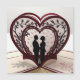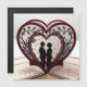 Dit ontwerp toont een romantisch en mooi tafereel van een paar dat onder een boom staat met verstrengelde hartvormige takken. De boom is versierd met ingewikkeld gedetailleerde bladeren en kleine vogels op de takken, waardoor een vleugje leven en warmte aan het tafereel wordt toegevoegd. Kleine hartjes herfsten op de achtergrond, verbeteren de romantische sfeer en voegen visuele diepgang toe aan het ontwerp. Het lijst rond het ontwerp versterkt zijn aantrekkingskracht en maakt het ideaal voor een trouwkaart die de liefde en tederheid tussen het paar uitdrukt. Dit ontwerp is ideaal voor gebruik als trouwuitnodigingskaart of een romantisch wenskaart voor elke speciale gelegenheid