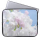 Macrofoto van een zachte lila bloemen van witte en roze kleuren tegen de achtergrond van groene bladeren en blauwe hemel. Getextureerde fotografie.