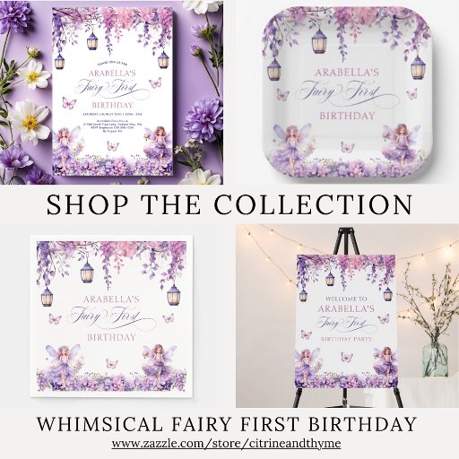 Vier de magische 1e verjaardag van je kleintje met deze betoverende "Fairy First" verjaardagsuitnodiging! Mooie lila en paarse bloemen, hangende lantaarns, vlinders en grillige feeën sieren deze mijlpaaluitnodiging. Nodig uw gasten uit om deel te nemen aan de magie terwijl u deze onvergetelijke eerste verjaardag viert!