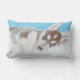 Een kleine husky puppy die op een witte deken ligt en op een blauwe achtergrond slaperig kijkt.