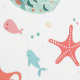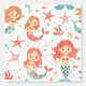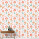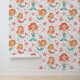Perfect voor een baby meisje kinderkamer of meisjesslaapkamer, dit behang heeft herhalende afbeeldingen kleine zeemeerminnen in verschillende posities. Samen met de schattige zeemeermin afbeeldingen zijn zeesterren, bubbels en vissen. De overheersende kleuren zijn blauwgroen blauw, sinaasappel en roze. Alles is op een witte achtergrond geplaatst.