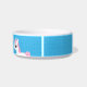 Een dierenkom met een schattige vectorillustratie van een witte Unicorn met een stromende roze mane op een blauwe achtergrond.