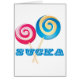 Twee lolly's in blauw en roze kruisen elkaar. De tekst luidt: Sucka.
