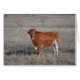 Foto van een langwerpige koe die in droog gras staat en haar neus likt.