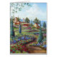 Italiaanse scène, veel blauw, groen, bloemen, dorp in afstand.