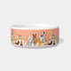 lots of cute dogs, cats, rabbits, birds and other small furry friends lined up waiting for their dinner. repeating pattern.