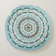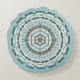Dit mandala-ontwerp bevat lagen van witte, turquoise en bruine patronen geïnspireerd door Keltische weven en Indische media, zoals wijnstokken, linten en lotusbloemen.