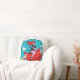 Een vrouw met vloeiend rood haar rijdt op een heldere rode hartvormige raket omringd door donzige wolken in een heldere blauwe lucht. De tekst luidt: Pas op voor de liefdesbombardementen!