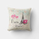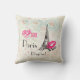 Een kussen met een mooie ondergrond met zwakke rozen en fleur-de-lis. Gelaagd over bovenkant is een illustratie van de eiffeltoren. Een roze lippenstift naast het beroemde landmerk dat xoxo zegt! en een fancy typografie die zegt: "liefde liefde liefde liefde" Parijs Bonjour! De tekst kan worden gewijzigd/aangepast aan uw behoeften.