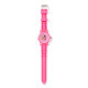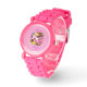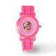 Roze glitterbandhorloge met de tekst "Love" met bloemenontwerp in licentie van Graphics Factory, met MoonDreams Music logo