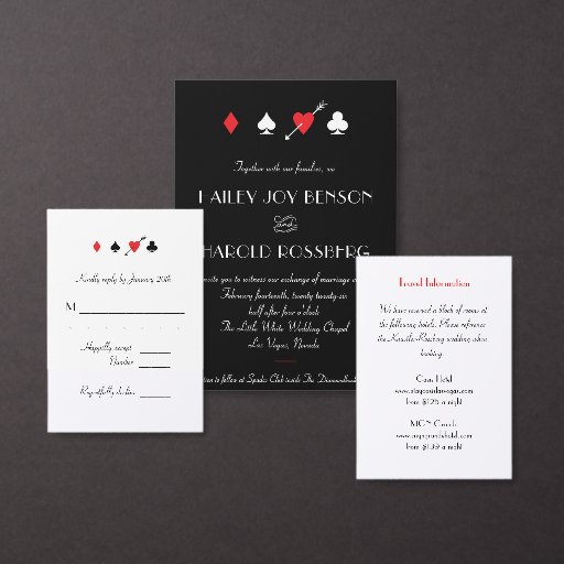 Eenvoudig en elegant, deze casino thema bruiloft uitnodiging behuizing kaart is voorzien van alle vier de kaart pakken in klassiek rood en zwart. Het hart is doorboord door pijlen als een brutale knipoog naar de liefde. Momenteel geformatteerd voor reisinformatie, maar eenvoudig aangepast aan uw behoeften.