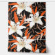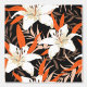 Enchanting white night lilies shine with striking clarity against a deep black background, surrounded by bold foliage in shades of burnt orange and warm brown. This striking contrast creates a powerful visual impact and adds unforgettable depth and character to the room. It's perfect for adding a contemporary earthy-tropical touch.