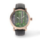 Stijlvol mannen-polshorloge met witte cijfers met het foto-afbeelding van een weelderig, groenblijvend conifeerbos in de Pacific Northwest. Selecteer uw horloge uit verschillende stijlen.