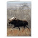 Bull Moose card verticaal. Een grote stier met moeraswolken door de schrobben in een zandheuvelgebied in Zuid-Alberta, Canada. Moose lijkt op zijn plaats in dit droge, zandige terrein dat weinig water heeft om de watervegetatie te ondersteunen die normaal gesproken voeden.