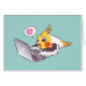Een schattige cartoon tekening van een cockatiel met een kannamonpitje met zijn Apple Macbook.