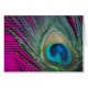 Heldere foto's van een pauw-veer. De felroze achtergrond met de donkere lijnen maakt een heel mooi effect.