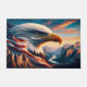 Een prachtige artistieke portret van een zeearend, met zijn hoofd naadloos overvloeien in de sterren en strepen van de Amerikaanse vlag, geplaatst tegen een achtergrond van torenhoge bergen en een serene riviervallei badend in de warme gloed van zonsopgang.