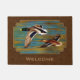 Mannelijke en vrouwen wilde eenden vliegen over een goudvijver, water rimpelt om de kleuren van het najaarsgebladerte op de achtergrond te weerspiegelen dat gloeit in het zonlicht, allemaal op een aardebruine achtergrond.