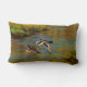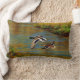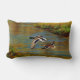 Mannelijke en vrouw wilde eenden die over een gouden vijver vliegen, rimpelen om de kleuren weer te geven van de achtergrondbladeren die in de herfst in het zonlicht gloeien. Realistisch kunstwerk gemaakt van een origineel oliesschilderij van natuurkunstenaar Crista S. Forest.