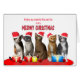 Een grappige en leuke kerstkaart met vijf katten die in een rij kerstmanden dragen. De woorden Meowy Kerstmis staan boven de katten. Een kerstkaart voor je moeder en vader.