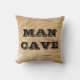 Op een oude weerswerende houten achtergrond, stuurt deze kussen een bericht dat je nu in een man grot bent. Ga op eigen risico in!